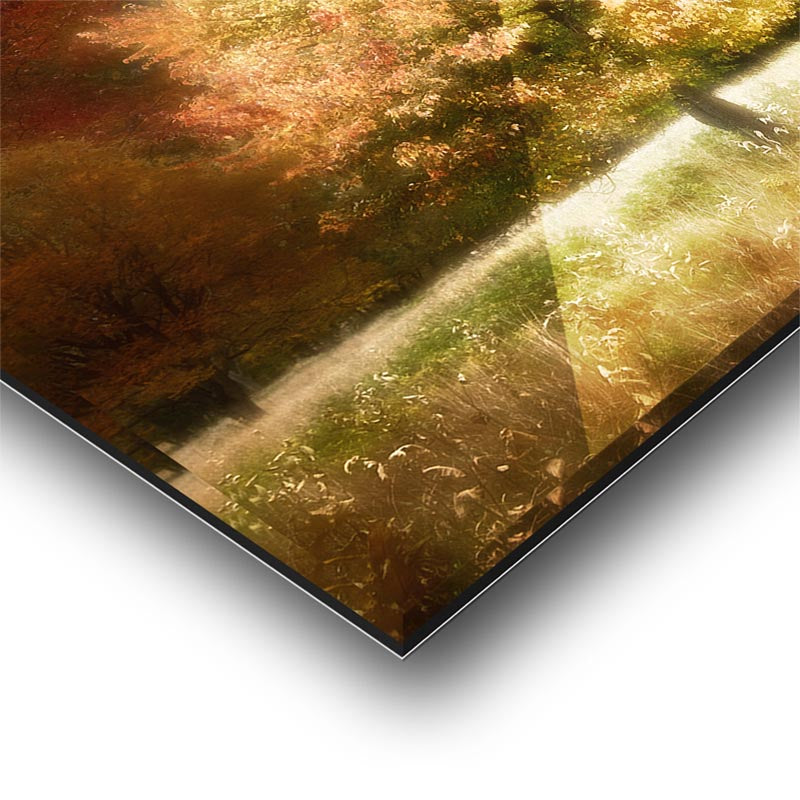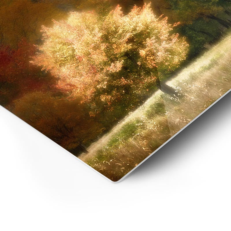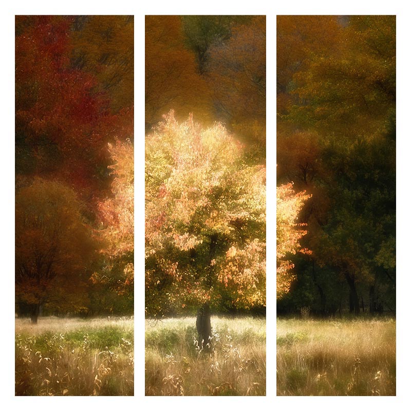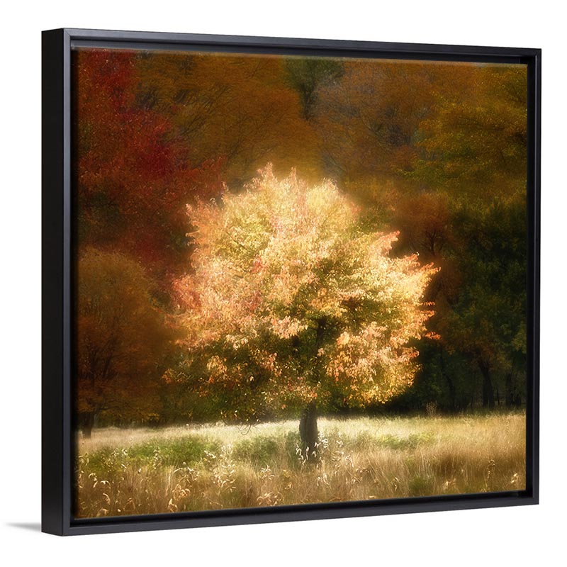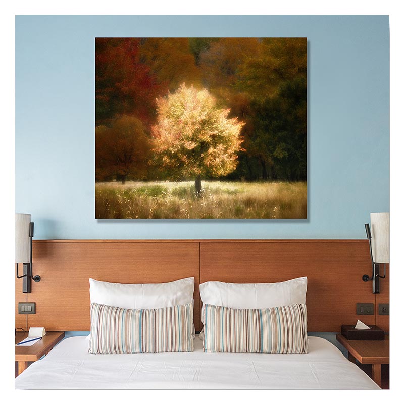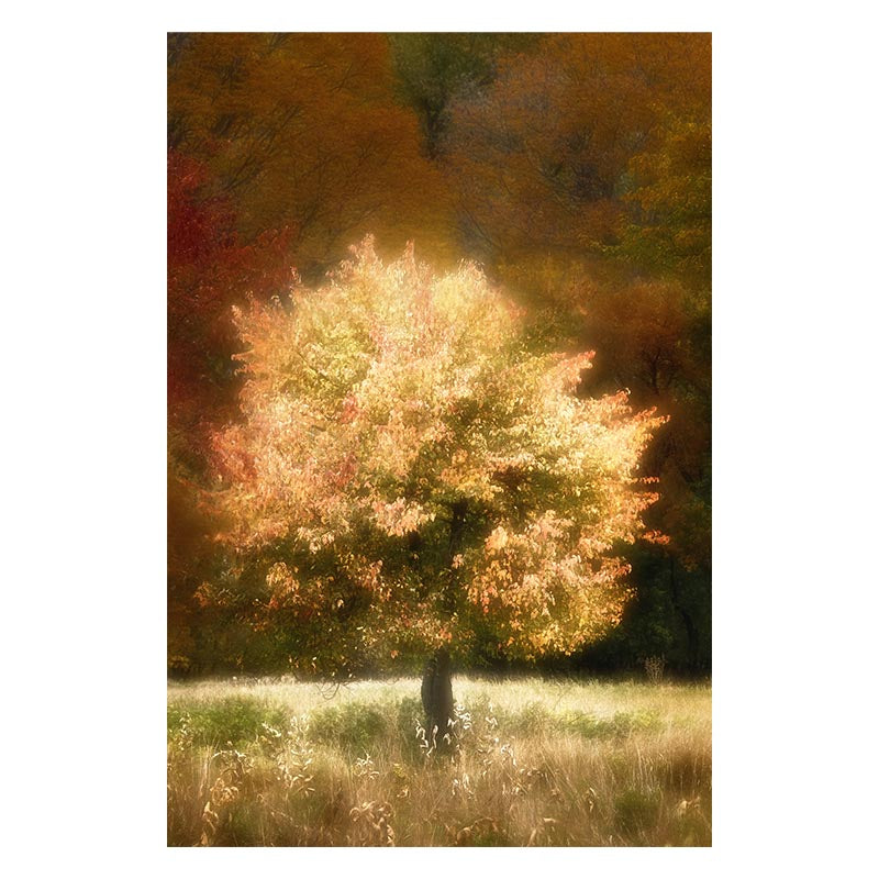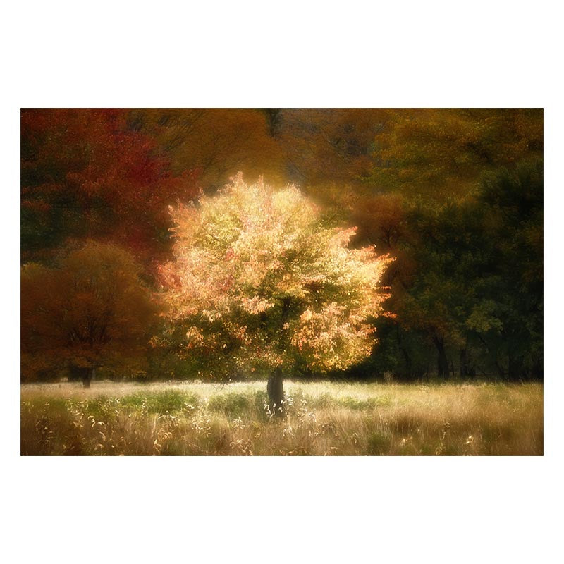 In the heart of a vast, open meadow, a single autumn tree stands like a beacon of warmth and light. Its golden leaves shimmer in the gentle breeze, catching the sunlight and glowing like embers against the soft, rolling grasses.