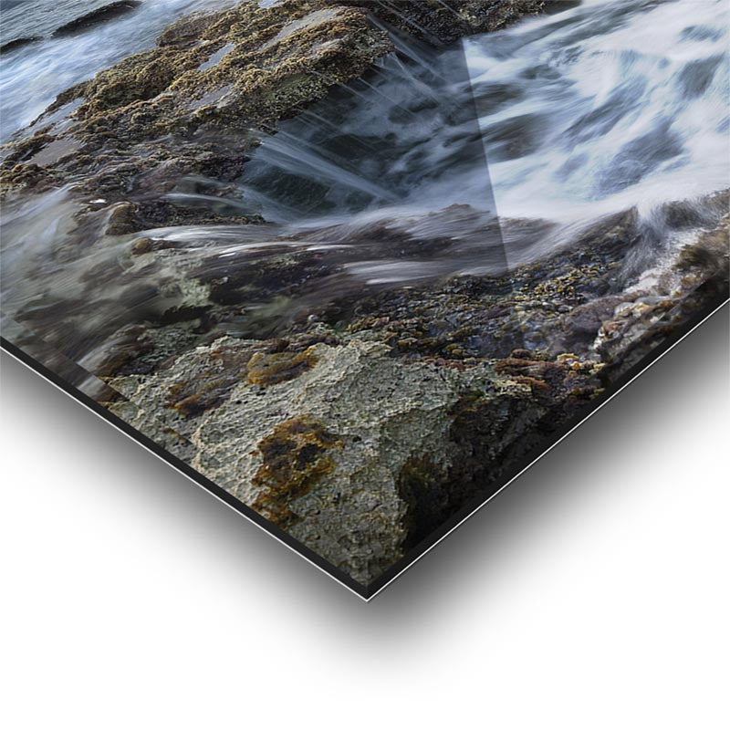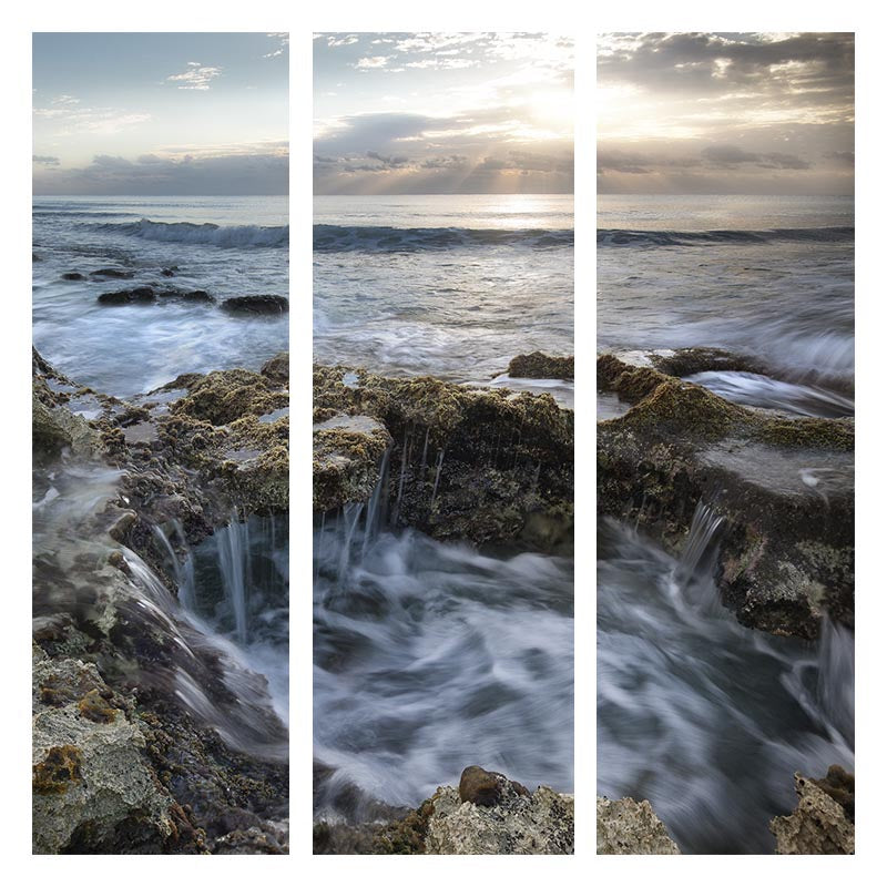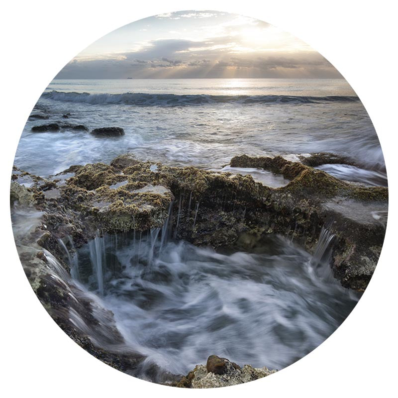 The golden sunrise stretches across the horizon, igniting the sky as the first light of morning dances across the ocean’s surface, where gentle waves roll toward the rugged coastline, their crests glistening like liquid gold. As the tide rises, water spills over jagged rock formations, cascading down in thin, silky waterfalls that shimmer in the morning glow.