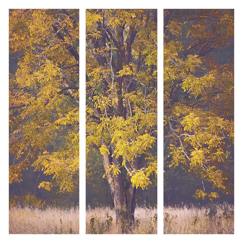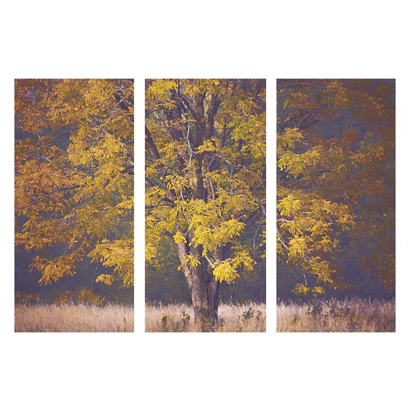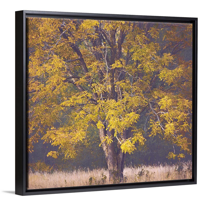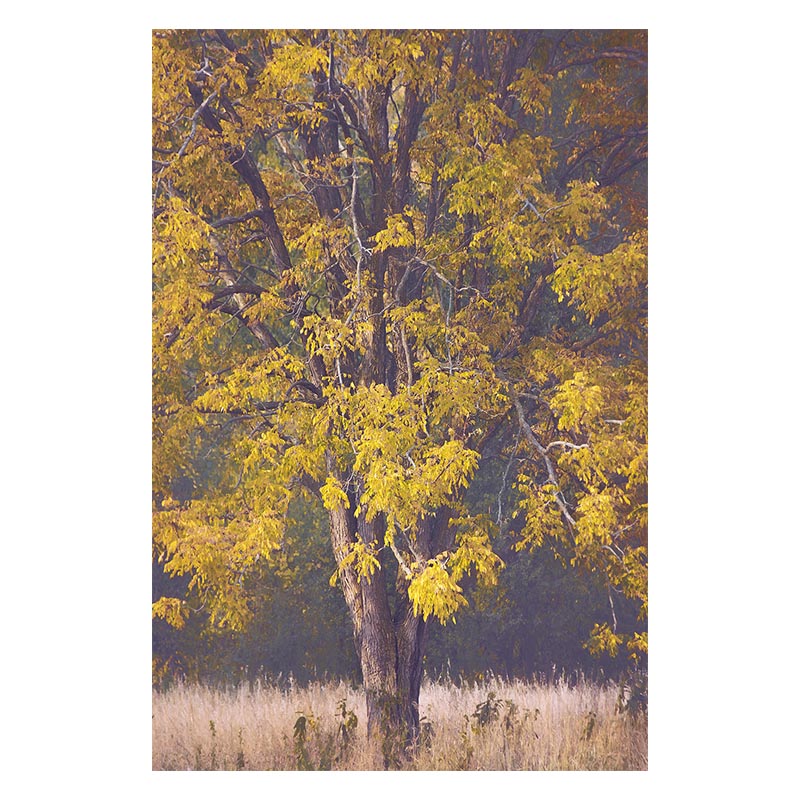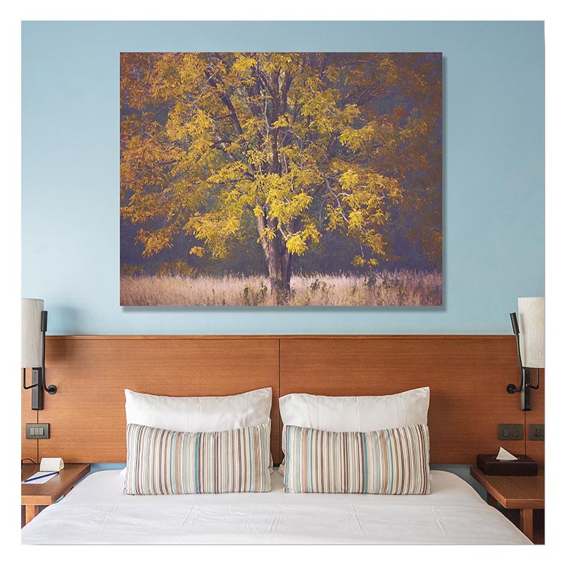 A solitary autumn tree stands gracefully in the heart of a vast golden meadow, its branches adorned with autumn leaves. The softness of this artwork brings the scene to life, create a dreamlike, almost ethereal quality.