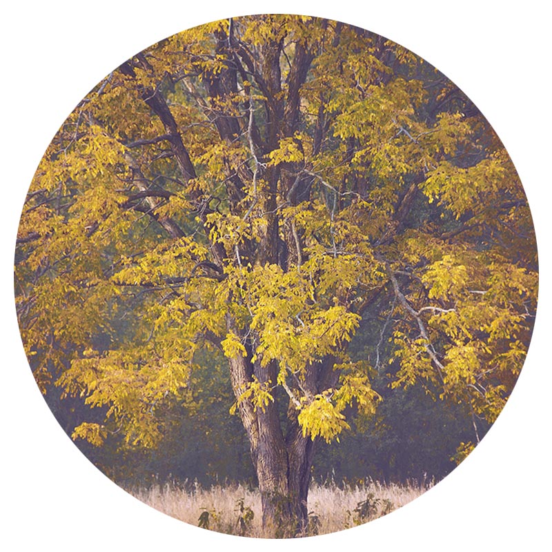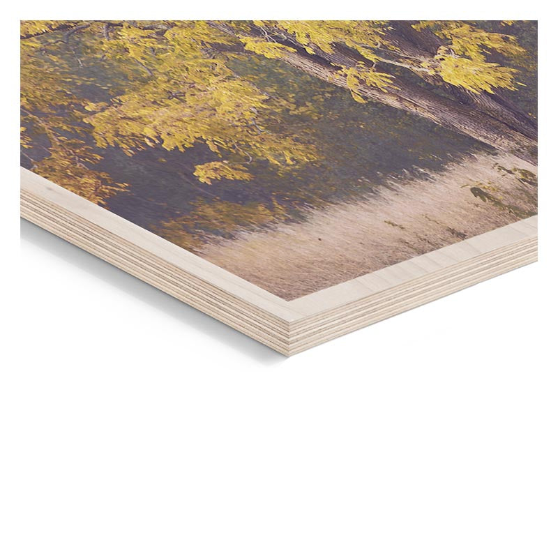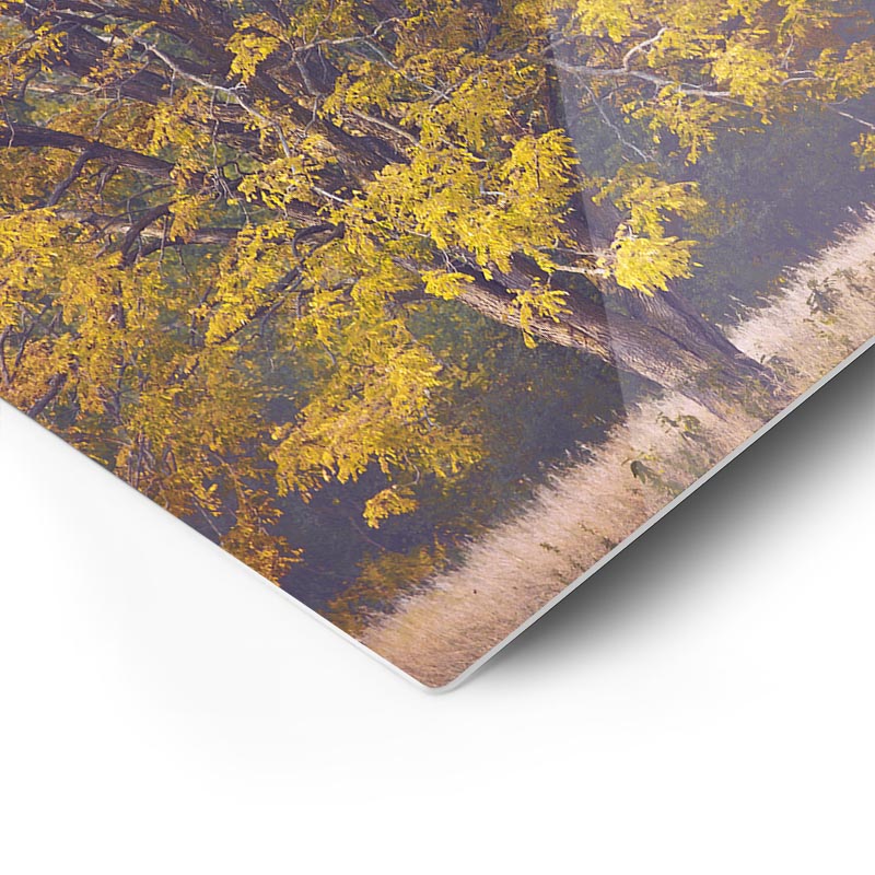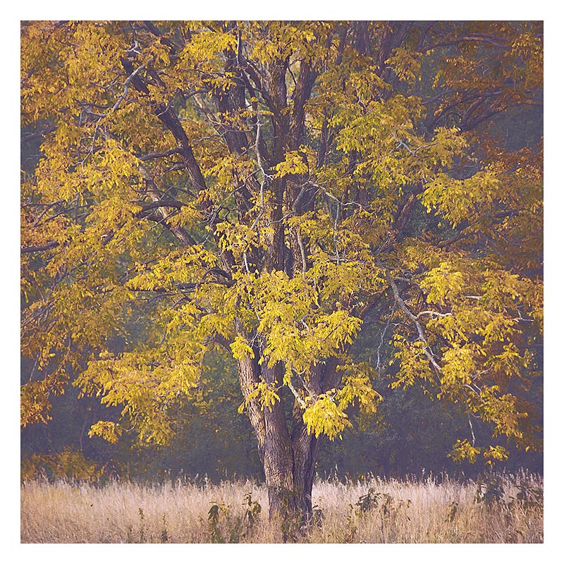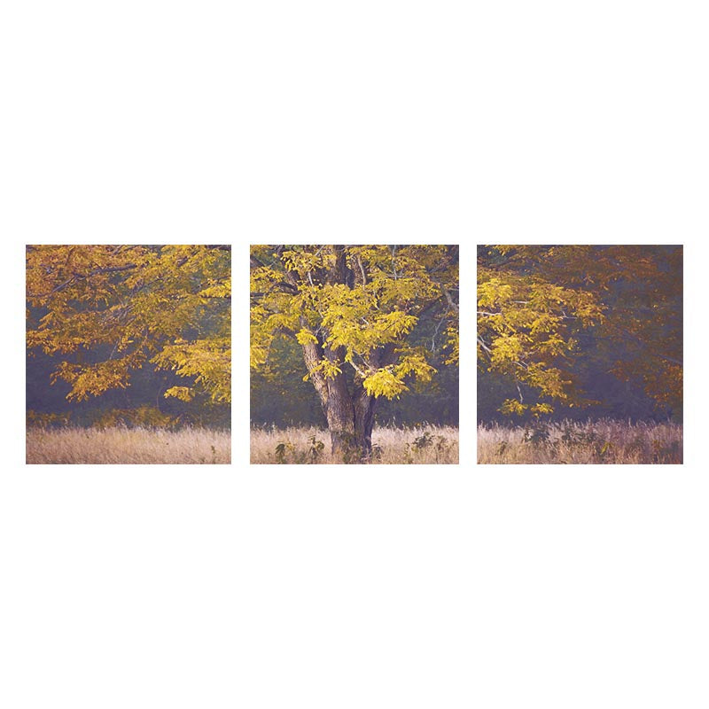 A solitary autumn tree stands gracefully in the heart of a vast golden meadow, its branches adorned with autumn leaves. The softness of this artwork brings the scene to life, create a dreamlike, almost ethereal quality.
